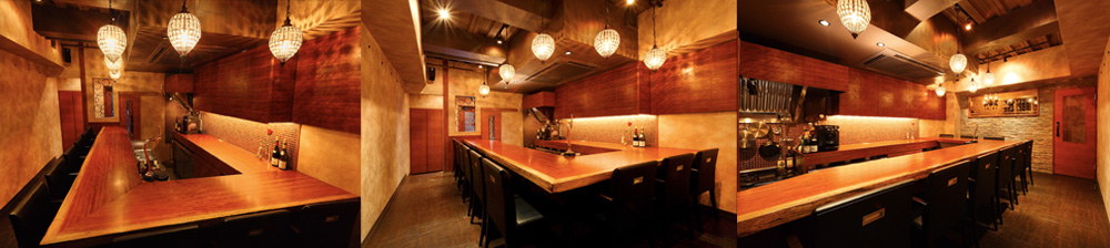 木(全てブビンガ)を基調とした落ち着いた店内、一枚板のローカウンター。ワイン好きのための空間をお楽しみください。ウォークインセラーからはお客様ご自身で選ぶことが出来ます。ワインを持ち込んでのワイン会(持込料3000円)も承ります。